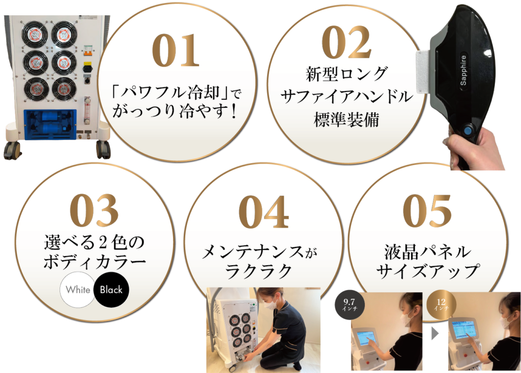 200V+冷却機能による、子供でも痛くない無痛脱毛をはじめ、4種類のハンドルで季節を問わず売上を支えます。